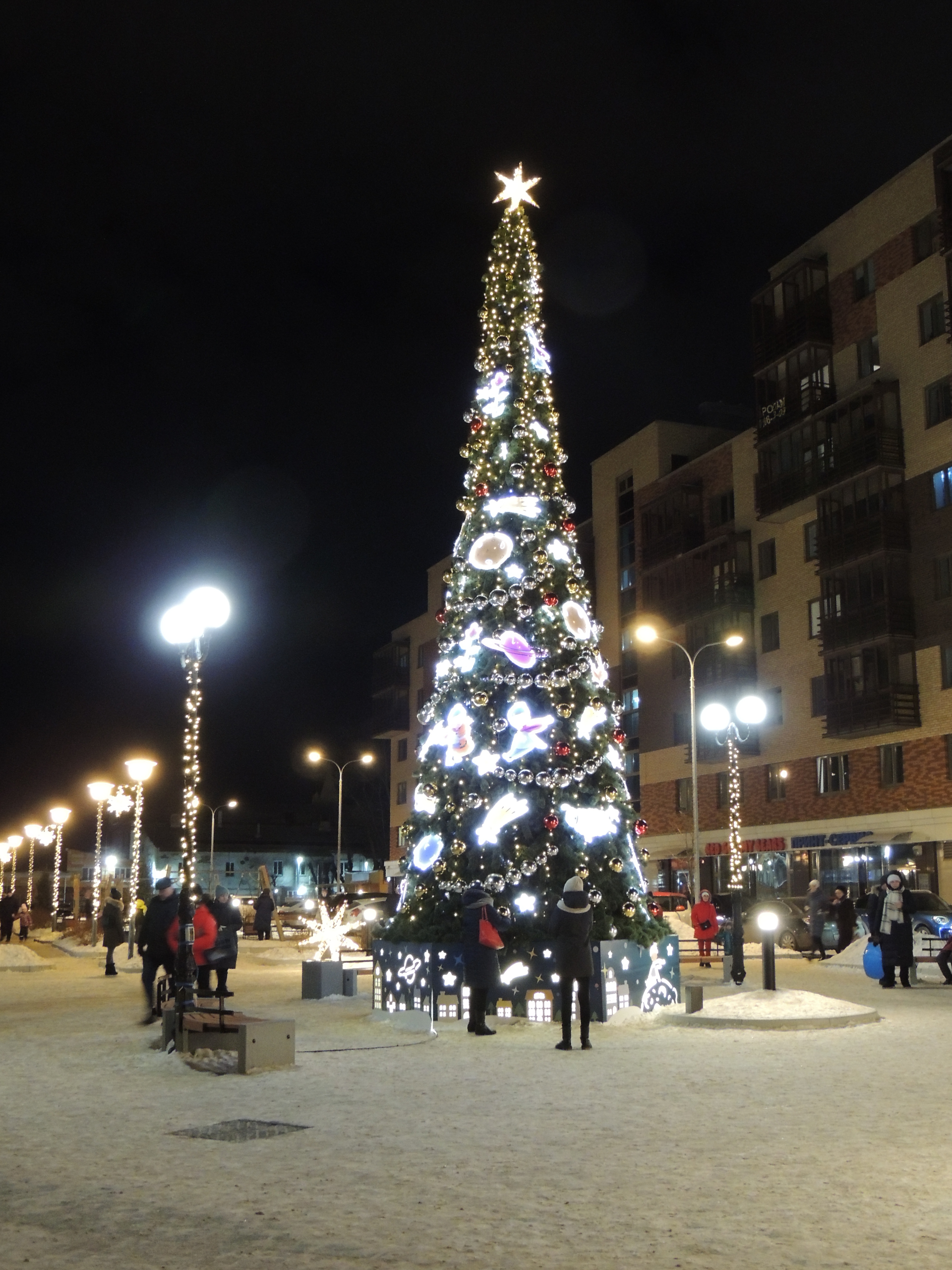 Вот тут у меня как раз сел аккумулятор в фотике, а смартфон ночные фото делает не ахти как. Хотя… Дальше по набережной всё равно особо и нечего снимать. Там есть ёлка, но она довольно скромная, неяркая.
